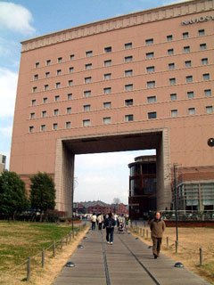 春の日差しは暖かく、やや強い風だが乾いていて爽やかだ。汽車道の途中には古い鉄橋が残されていて、1907年製という銘板があった。きっと絵本に載っているような小さな蒸気機関車が、小さな貨車を牽いてのんびり走っていたのだろう。その線路をまたぐように大きな建物がある。横浜国際船員センター