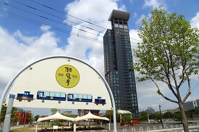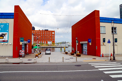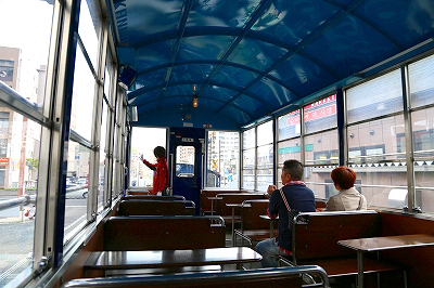 「潮風号」が走り出す。ゴトゴトと音が大きく、振動が尻に伝わる。トロッコ客車はもともと貨車だった。台車は貨車時代のままで、この揺れもトロッコらしさのひとつだろう。大きな通りを踏切で横切り、左手からちらりと船着き場が見えた。こちらが海側。青と茶色の明るい色使いの建物がある。観光客向けのレストランや土産物屋のようだ。線路の左側、つまり海沿いに観光客向けの施設があるようだ。