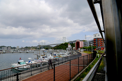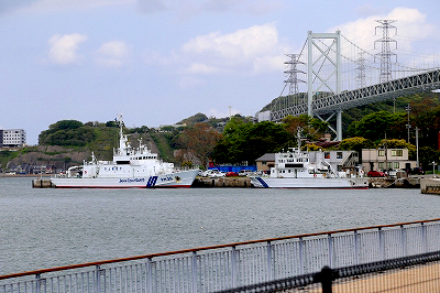 空いているから左右の座席をウロウロして、車窓左側の座席に戻った。海が迫っている。小さな漁船がこちらを向いてズラリと並んでいる。前方に関門橋が姿を見せた。その袂には海上保安庁の巡視船が停泊していた。白い船体が美しい。望遠レンズで眺めたら“きくち”、“はやなみ”という船名が読めた。大きいほうの“きくち”は大型カメラと機関砲を装備している。警察に例えると機動隊とパトロールカーの組み合わせだろうか。