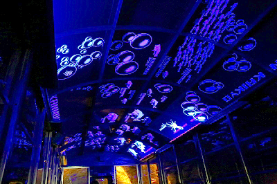 客車の天井に海底の様子が投影されている。海底トンネルだと勘違いしそうだ。トロッコ客車はトタン屋根のようで、殺風景だけど雰囲気としてはアリだと思った。その盲点を突いた演出だ。これはいい。何も知らない人を連れてきて、ビックリする顔を見たい。