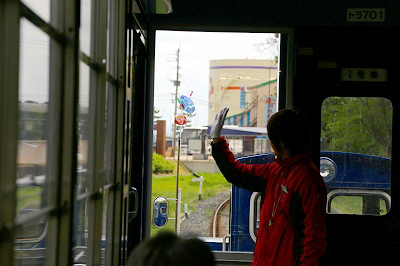 トロッコ号発車。アテンダントさんが手を振る相手は踏切の親子