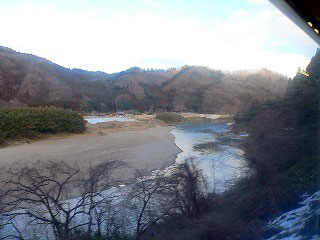 ここから阿武隈急行の後半になる。私はまず進行方向左側に座った。富野を過ぎてしばらく走ると阿武隈川が姿を見せる。瀬上では橋で渡ってそれきりだったけれど、ここからは線路が川に沿っている。この辺りからが阿武隈急行らしい車窓風景と言えるだろう。兜を出ると電車は加速し、かなりのスピードで小さなトンネルを抜ける。少し川が遠ざかり、今度は長いトンネルに入った。ここから宮城県である。傍らの阿武隈川が下り続けていくので、この山は分水嶺ではない。しかし人の流れは分けている。阿武隈急行は福島側は富野、宮城側は丸森で折り返す列車がある。このトンネルを通る列車は全列車のうち半分ほどだ。そのトンネルを抜けると阿武隈川が寄り添ってくる。
