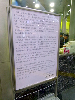 ふと顔を上げると、改札口の隣に看板が立っている。文字が細かい。列車の遅延か運休の案内かと思ったら、福知山線脱線事故のお詫び文だった。平成17年、もうあれから7年になる。1月に経営者の責任を問う刑事裁判が行われ、経営者は無罪。検札の控訴断念で結審した。しかし贖罪はまだまだ続くのだ。
