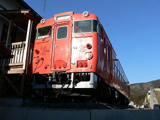 構内には赤い国鉄型のディーゼルカーが一両停まっている。よく見ると線路が本線と繋がっておらず、車両の行先表示機は"鈍足"と書かれていた。廃車体を保存展示しているらしい。駅員氏に尋ねると、駅に隣接した温泉施設がカラオケルームとして使っているという。「これには乗れないのかと、よく間違われます」と笑った。