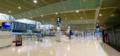 早朝の空港ターミナルビル出発ロビーはひっそりとしている。ここは国際線で、この時間の出発便はないのだろう。成田空港は23時から06時まで離着陸できない。電光掲示板を眺めに行くと、始発便は09時30分のグアム行きだった。3時間半も前なら係員さえいないわけだ。広大な施設を独り占めである。つまらないから国内線の出発手続きをしよう。国内線チェックインカウンターは1階だ。エレベーターで降り、ビルの端まで歩いて行くと、ようやく旅行者たちの姿があった。ただし、チェックイン開始は06時30分。あと30分をどうするか。