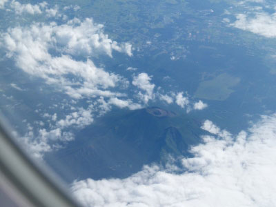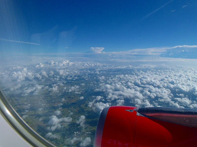 07時45分出発予定のエアアジア8521便は、定刻より早くタキシングを始めた。乗客が予定より早く全員集合したようだ。飛行機はくねくねと走り回り、いったんB滑走路を横切って側道を北へ進み、B滑走路北側から南へ向かって離陸した。そのまま上昇しつつ直進し、九十九里浜に出ると右に旋回。窓の下に成田空港を見せてくれた。そこからまた上昇を続けて雲に入った。