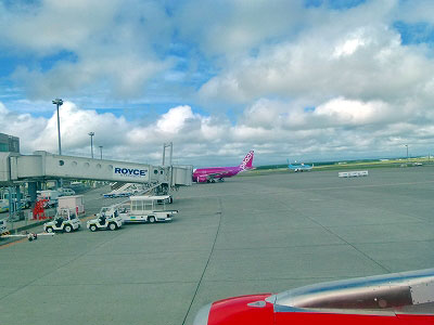 千歳空港はボーディングブリッジを使用。羽田には来ない関空拠点のLCCがいた