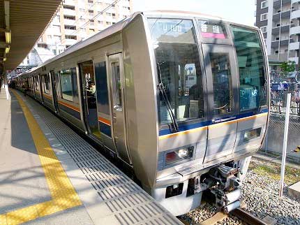 その放出駅から片町線の電車に乗る。15時23分発。予定より22分の遅れだ。銀色の車体に紺と橙の帯を巻いた207系電車であった。行き先は西明石で、京橋からJR東西先に乗り入れ尼崎へ到達し、さらに東海道本線、山陽本線に乗り入れる。始発は片町線の長尾駅で、2時間以上のロングラン列車だ。