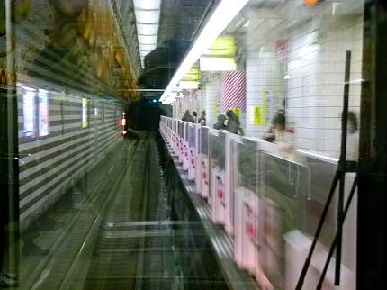 片町線から引き続き運転室の後ろにかぶりついている。運転台の背後は反射防止のため幕を降ろされてしまったけれど、右側は開いている。真っ暗なトンネルに、ヘッドライトに照らされた線路が光る。信号機の青い光がぽつんぽつんと現れる。新しい地下鉄は車内信号機式が多いけれど、この路線は地上信号式だ。片町線や福知山線に合わせたらしい。青い燈光は線路も淡く照らし幻想的である。