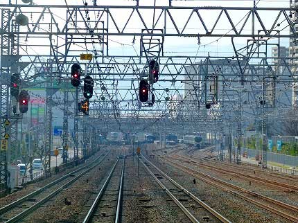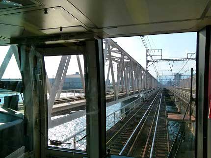 加島駅で停車中、前方にトンネル出口が見えた。コンクリートの壁の間の勾配を上っていくと、東海道本線の線路群の間に出た。大きな鉄橋で神崎川を渡り、線路群を眺めつつ走っていけば、前方に尼崎駅が見えた。島式ホームが4つもあり、線路と分岐器が多い。鉄道好きには心が踊る景色である。