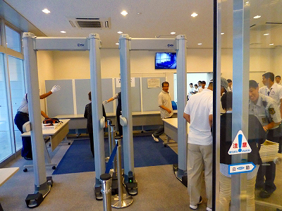 正面の建物はリニア中央新幹線の駅を模しているようだ。全面ガラスの向こうに搭乗券発見機が見える。鉄道と言うより、航空機の雰囲気である。そこは入り口ではなく、左側を向くと自動ドアがある。中に入るとすぐに荷物検査場があった。まるで空港だ。カゴに鞄を載せ、ポケットの中身をぶちまけてゲートを潜る。