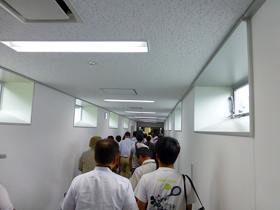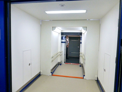 説明会が終わると、いよいよ搭乗だ。空港の搭乗橋のような細長い通路を歩く。高いところに明かり取りの窓があるほかは白い壁。空港の搭乗橋なら飛行機の機体が見えて気分が盛り上がるところだ。しかし外は見えない。仕方ない。ここはレジャー施設ではないし、開業したら駅は地下で窓もないはず。搭乗口は厚い壁で囲まれている。車体は見えず、ぽっかりと乗降口が開いている。これも飛行機と同じだ。