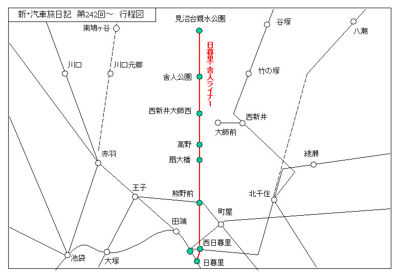 西日暮里を出ると、軌道は真っ直ぐ北へ向かった。屋久橋通りは東京都市計画道路放射11号線として計画的に作られた道である。人工路だから一直線で、埼玉県に入ると第二産業道路という名で引き継がれる。地元の車だけではなく、国道から溢れたトラックなどもこちらを通る。故に混雑が激しくなったというわけだ。地元以外のクルマのおかげで、バスに乗っても渋滞で進まない。なるほど、これでは鉄道が欲しくなる。いま、この電車は屋久橋通りのクルマを追い越しているわけで、その様子を眺められたらどんなに優越感があるかと思う。