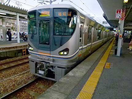 前面展望に視線を戻すと、新型特急電車287系とすれ違った。車内放送が次の停車駅、川西池田を告げる。ここで丹波路快速に接続するという。当初の予定通りの列車である。川西池田駅で待っていると、先に国鉄型183系電車の特急、こうのとりが通過していった。こうのとりは兵庫県豊岡市で繁殖に取り組んでいるという。子供の頃は「赤ちゃんを運んでくる鳥だ」といわれたものだけど、最近は聞かない。いまや小学生も携帯電話を持つ時代。お伽話はデジタル情報からこぼれていく。