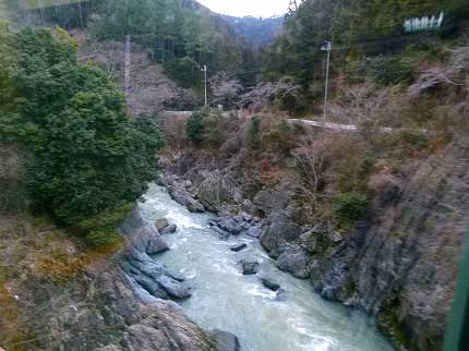 風景が一変し、建物の密度が下がる。福知山線は大阪に直通する便利な路線だけど、古市駅あたりの風景は寂しくて、こんな所にひとりで暮らしたら泣きたくなりそうだ。篠山口からはドアが手動になり、単線となった。晴れ間が見えている。線路は篠山川に沿って、列車は谷間を駆け巡る。工場街、ベッドタウン、そして田舎の風景。福知山線の車窓はおもしろい。
