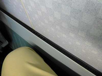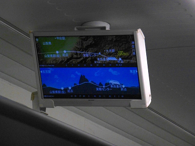 窓の上に荷棚がある。今日は誰も置いていない。試乗会では大きな荷物を持ち込まないよう注意書きがあった。そもそも本当の旅行移動ではないから、旅行鞄を持ち込む人はいない。天井には液晶モニターが取り付けられている。ここには現在位置、速度などが表示される。景色のない列車の中で、もっとも注目される物体である。