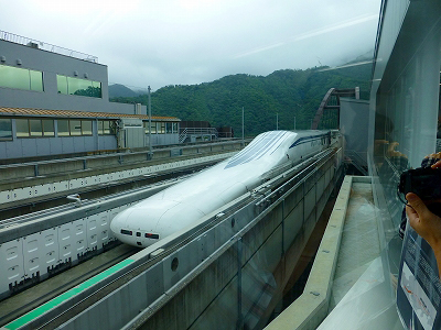 L0系がゆっくりと走り始めた。助走である。推進力ははじめから磁力だけど、浮上するまではゴム製タイヤが車体を支えている。ざらざらとした接地感があり、新幹線と変わらない気がする。液晶パネルの速度表示がぐんぐんと上がっていく。現在の新幹線でも表示してくれたら良いのに、と思う。