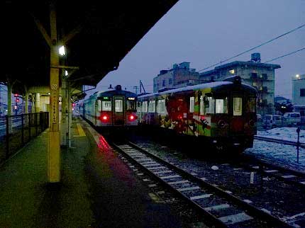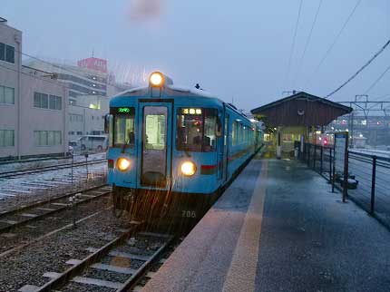 いや、違った。周囲が明るくなって構内が見渡せるようになると、乗り場はホームのずっと先の方にあった。駅舎の近くは車両の待機所であった。福知山行きは私が見えないところですでに発車していたらしい。始発に乗る予定だったら乗り遅れていた。明かりのついた車両が前に進み、乗り場に停まった。2両編成。前が西舞鶴行き。後ろは福知山行き。雪の勢いが増している。西舞鶴行きの客は私だけだ。