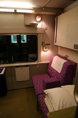 E26系客車で平屋構造といえば展望スイート、デラックス、コンパート、ツインの4種類があり、スイート、デラックス、コンパートは1部屋しかない。どれも人気で入手は難しく、コンパートは車イス利用者優先である。ツインの平屋も数が少なく、よく取れたなあと思う。乗り込むと、天井が高いため、想像していたより広く感じる。1階、2階のツインより快適だ。