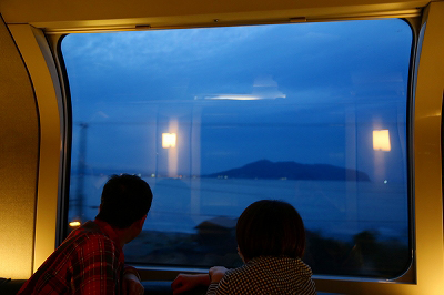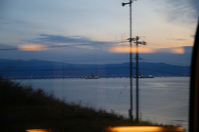 函館山が見えると鹿児島湾だ。漁船が2隻、投光器を使っている。あれが現代の漁り火だ。北海道新幹線開業後、いま走っている線路は第三セクターの経営となる。会社名は“道南いさりび鉄道”に決まった。社名の由来となった漁り火である。これも昼間は見られない景色だ。