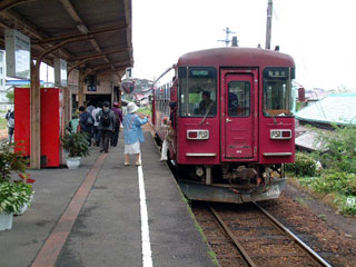 北濃行きの列車は2両編成で、乗客は多い。行楽の装いが多く、休日らしい雰囲気だ。途中の"みなみ子宝温泉"駅に行くのだ。この駅は駅舎に隣接して温泉浴場があり、露天風呂、檜風呂、釜風呂があるらしい。予想通りほとんどの乗客はここで降りた。ホームには人があふれているけれど、上り列車を待っているのか、この列車には乗り込まない。今回の旅は帰りの時間を気にしなくていいので、気軽に立ち寄れそうな"足湯"に惹かれたが、人手に圧倒された。