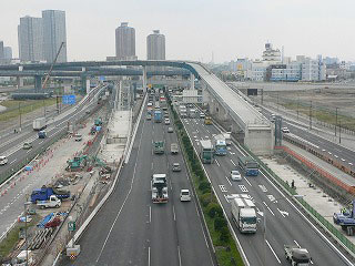 有明コロシアムの脇をすり抜けると列車は首都高速湾岸線を越える。相変わらず交通量が多い。道路の脇に作りかけのスロープがあって、高速道路の出入り口を新設するらしい。ここが築地市場の最寄のインターチェンジになるのだろう。築地市場の移転は、食料の産地からやってくるトラック群を渋滞する都心環状線から広い湾岸線へ退避させるという意味合いもあるようだ。それは良いことだけれど、銀座と築地をリアカーで往復している料理人には遠い場所だ。