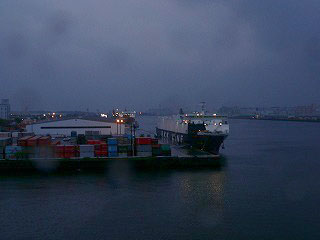 国際展示場正門の次は青海。展望席から前方を眺めれば、東京レジャーランドの向こうに船の科学館が見える。その手前をゆりかもめの水色の線路が横切っているけれど、あそこへ向かうまでにはいったん左折して、テレコムセンターを迂回することになる。新橋へ急ぐ人は青海から右折してお台場に向かってほしいと思うだろう。しかし、ゆりかもめは巡回路線が基本方針である。埋立地のすべての街を経由するのだ。車窓右手にはお台場のシンボルともいえる観覧車がネオンを光らせている。反対側の車窓左手には港があって、貨物コンテナ船が泊まっていた。今日の荷役は終わったらしく、ひっそりとしていた。