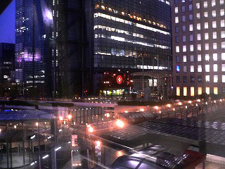 日が落ちて、車窓に景色が映らなくなってきた。列車はレインボーブリッジを渡り、その高低差を克服するためのループ線を下っていく。芝浦ふ頭、日の出は倉庫街で暗いけれど、竹芝あたりのビルは明るい窓が並んでいる。ようやくビジネス街に入ったようだ。しかし、この明かりで驚いてはいけない。次の汐留はまるで光り輝く未来都市である。まばゆいばかりの光に心が洗われるようだ。この景色、以前にゆりかもめに乗ったときは見なかった。当時の汐留は再開発の真っ最中で、周囲に建物はなく、駅も用意されていたけれど開業していなかった。あのころの列車はすべて真っ暗な汐留駅を通過していた。