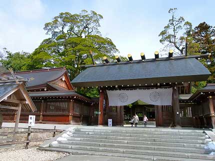 ケーブルカーはこちら、という矢印に従い、国道を渡ると籠神社の境内に入る。「このじんじゃ」と読むそうだ。一宮桟橋の一宮とはここである。一宮は地域でいちばん格の高い神社に与えられる呼び名で、籠神社はその格にふさわしい構えであった。天照大御神が伊勢神宮に移る前に巡った地のひとつ。故に元伊勢ともいう。