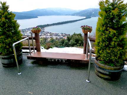 たった130mの標高差ながら、傘松駅はひんやりとしていた。周辺は展望公園になっている。人が歩かないところに雪が残っている。ふもとは地面も乾いていたけれど、少しでも高いところへ行くと雪がある。宮津線の車窓もそうだった。これが日本海側の春の気候だろうか。