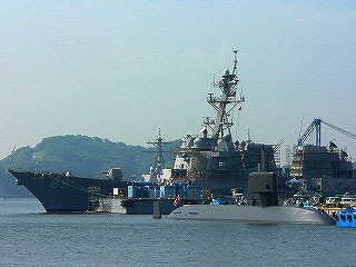 カメラを構えた場所から右へ向くと、そこはもう海だった。休憩してもいい頃合だと思い、海岸へ歩いていく。海岸は公園として整備されていた。ベンチもある。座ろうかと思ったときに軍艦を見た。そうだ。横須賀は米国艦隊と海上自衛隊の基地の街だった。左手の米軍の港は逆光で判別しがたいが、右手の自衛艦隊基地は船が良く見えた。ドーム状のレーダーをたくさん載せた船がイージス艦だろうか。よく見ると手前には潜水艦の黒い影が海上に顔を出している。ここに住んでいる人にはいつもの景色だろうけれど、私には珍しくて仕方ない。