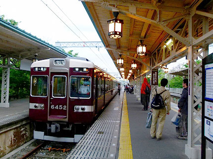 阪急嵐山線は4年ぶりであった。いくらか改装されたようで、ホームには行灯のような和風の照明が並んでいる。白人のファミリーの奥さんが、その行灯をうっとりと眺めている。「家にも置きたいわ、どこで買えるのかしら」「これはたくさん並んでいるからいいのさ、ウチのガレージには2つくらいしか置けないよ」という会話をしているようだ。