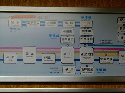 阪急今津線は、兵庫県の東側を南北に走る路線である。さらに東側に武庫川が流れており、ほぼ並行している。この西宮北口駅で神戸本線と交差する形になっているけれど、実際は分断されている。今津南線と今津北線と言いたくても、北側に今津という地名はない。南側を今津線、北側を西宮線、あるいは途中駅をとって仁川線としてもよかったか。いや、仁川は韓国の空港都市だから遠慮したほうが良かったか。