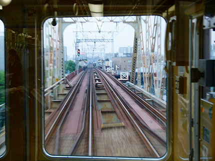 私はまず、今津 "南線" を往復した。たった2駅の路線だ。夕方という時間帯もあって、買い物帰りのオバチャンや帰宅部の女子学生で満員だった。女性専用車かと疑うほどであった。運転席越しに前方を見つめていると、複線の線路がまっすぐ伸びている。途中の阪神国道駅で上り電車とすれ違う。このダイヤなら単線でもよさそうだ。高架化に当たって単線化しなかった理由は、きっと朝の増発にあるのだろう、と想像する。平面交差がなくなり、高架化されたとはいえ、神戸本線と接続する線路が設けられている。車庫は神戸本線側にある。