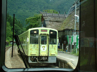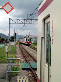 私の記録では1984 (昭和59)年にここを訪れている。20年ぶりの再訪になるわけだが、何も思い出さない。もっとも、第三セクター化にともなって、大幅な合理化が行われ、当時とは様子が違うかもしれない。まっすぐ走ってきた線路が、駅にさしかかると少しホーム側に寄る。駅を出るとまた戻る。妙な構造だが、以前は列車のすれ違いができる設備があって、片方だけ撤去された結果である。