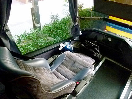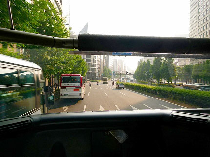 出発ゲートを潜り、暗い駐車場に向かった。なるほど、WILLER EXPRESSのピンクのバスではなく、スリーポインテッドスターのバスが待っていた。割り当てられた座席は二階席の最前列だ。格安枠のチケットだけど、購入した料金にかかわらず、チェックインした順に座席が割り当てられているようだ。まるで展望座席。補強材のようなバーが目障りだけど、良い景色である。