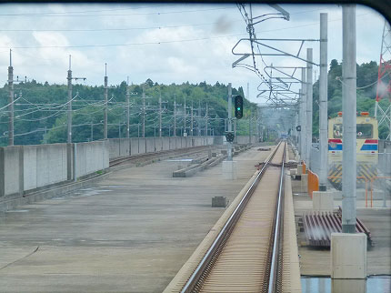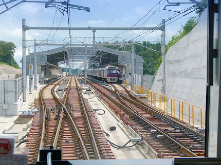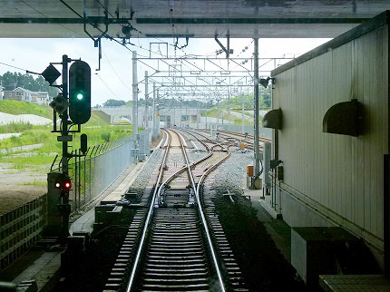 出発信号が青になり、運転士がマスコンを倒した。電車がスルスルと走り出す。8年前に行き止まりの壁だったところがくり貫かれ、築堤がさらに続いている。壁のところはコンクリート地盤になっていて、上を道路が通っているようだ。線路の脇にも口があいており、新しい道路が作られそうな気配である。築堤の上で上り下り分かれていた国道484号が、印旛日本医大駅の手前で右に折れていた。国道484号は蛇行しているから、線路の脇を使って延長し、バイパスをつくるのだろう。