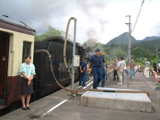 次に大休止する津川では、給水風景が見られた。蒸気機関車の全盛期は、線路をまたがるように給水塔を建て、そこから水を落としていた。しかしそれは昔のこと。蒸気機関車の廃止と共に撤去されてしまい、現在はホームからホースを伸ばして給水する。