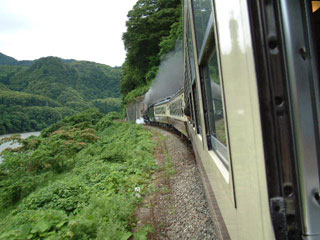 『SLばんえつ物語』号は、喜多方までは会津盆地の平坦な区間を走る。蒸気機関車はチカラに余裕があるせいか、あまり煙を出さない。窓を開けても煙にまみれることはなく、その代わりに涼しい風が入ってくる。雨が上がったばかりで、空気は湿っているけれど、気温が低いから心地よい。