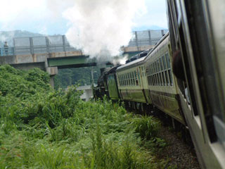 福島県から新潟県に入ろうとしている。峠に入ったため、列車の速度が落ちた。しかしここからが蒸気機関車の見せ場だ。石炭を激しく燃やし、煙をたくさん吐き出す。その煙が窓の外をよぎる。Mさんが窓を開けているから、油混じりの炭の臭いが漂ってきた。私も窓を開け、煙と音を楽しんだ。機関車はゴゴゴと低音を響かせ、ボォッと短い汽笛を何度も鳴らす。踏切やトンネルを通過するときの警笛だが、沿線でビデオカメラを構えるファンへのサービスもしているようだ。機関車直後の車両に座席を指定してよかった。