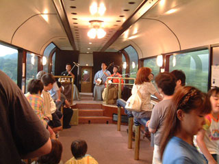 7両編成の客車の真ん中、4号車は "展望車" としてすべての乗客に開放されている。窓が大きく、その窓に向かうようにバー式のベンチとスツールが配置されている。カラオケバーのようなステージがあって、津軽三味線の演奏会が行われていた。SLと三味線の関連性がよくわからないけれど、駅を発車したあと、スピードが乗ってくるまでの揺れと三味線のリズムがシンクロする。曲名は知らない。それでも良い選曲だと思う。車窓は雨だが、弦の響きと流れる景色を見ていると、なにやら気分が晴れてくる。