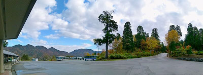 停留所の正面に林があり、針葉樹と広葉樹を寄せ植えた庭園のようだ。その中央から道が続いていく。紅葉で作られた門のようである。バスを待っている間、この道を歩いてみたいなあと思って眺めていた。室堂行きのバスはその道を入っていく。これは嬉しい。沿道はずっと紅葉の林の中である。