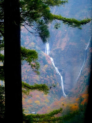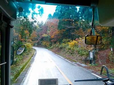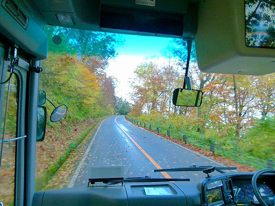 三色の紅葉の間をほとばしる真っ白な筋。間近で見たら迫力があるだろうけれど、この風景も素晴らしい。バスは滝に正面を向けて停車した。私は前面の大きなガラス越しに見た。その後、バスのすべての乗客に見せるため、バスは展開しつつ小刻みに停まった。私の後ろのほうで喜びの声が上がり、さらにバスの後ろの席へと波及していく。