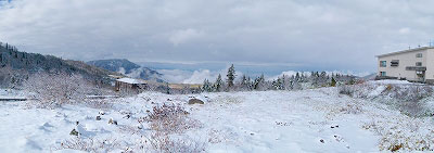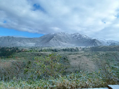 その間に見た景色は、いままで私が見たことのない風景だった。青空の下のカルデラは真っ白な山に囲まれている。その下の全く同じ高度で、白色が一直線に仕切られて、そこから麓までは紅葉に彩られていた。雪と紅葉の境目であった。日差しの強い空の下でも、幻のような景色がある。息が乱れ、頭が破裂しそうなほどズキンズキンと脈打っている。でも、途中で引き返さなくてよかった。