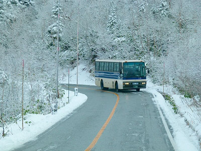 風景は真っ白だ。ここはもう冬のエリアである。片側一車線の道で、すれ違うクルマはこちらと同じ色のバスだけ。この道は富山県道の立山有料道路だけど、通行可能な期間はマイカー規制が実施されている。立山高原バスの専用ではないから、緊急車両と観光バス、沿道で施設を営む人たちの許可車両も通れるはず。団体観光バスの姿がない理由は、やはりシーズンオフだからだろう。美女平の紅葉とこの雪景色の変化は楽しい。お客を後悔させない景色だと思う。団体旅行の時期の見極めは難しい。