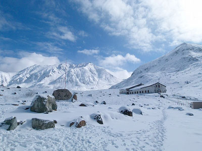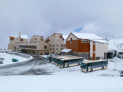 ターミナルビルに戻らずコースを外れて、ビルの反対側、つまりバスターミナルの向こう側に回った。室堂のビル全景を写真に収めるためだ。実はここ、日本で最も高所にある駅である。鉄道はないけれど、ここから大観峰までの立山トンネルトロリーバスが鉄道事業法にもとづいて運行されている。だから駅というわけだ。