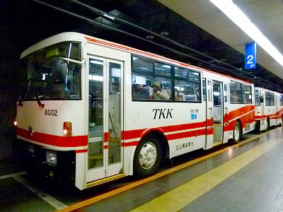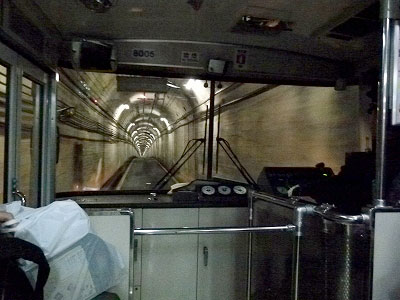 前後2台のバスのうち、もちろん前のバスに乗る。後ろのバスに乗ったら、前のバスに遮られ、前方の景色を楽しめない。全区間が立山の直下のトンネルだけど、これも景色のうちだ。それに地下鉄よりは明るい。バスはビルの地下駐車場のような空間から発車した。エンジン音はなく、ウイーンという機械音。電車のような音だ。車内に電光掲示板があって、「レールはありませんが電車の仲間です」という文字が流れた。
