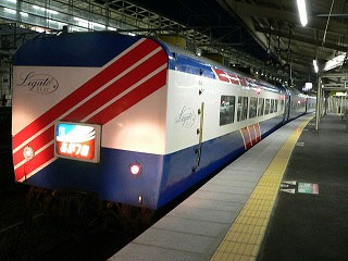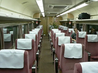 やがて轟音と共に青い機関車が迫ってきた。私の目の前をゆっくり通り過ぎる。機関車の次は青い電源車で、ディーゼル発電機が呻りをあげている。さらに同じ色の客車が続く。4号車までが熊本行きの寝台特急『なは』である。5号車から長崎行きの『あかつき』だ。私の前に停まった客車は8号車。うしろにはさらに2両繋がっている。最後尾は白い客車で、これだけがレガートシートという座席車だ。ちょっとのぞいてみたら、高速バスのような3列シートが並んでいた。普通車指定席の扱いだが、グリーン車並みのゆったりとした配置だ。