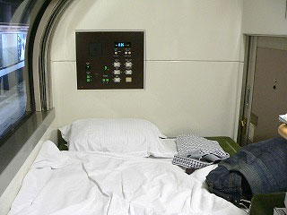 8号車は中央に通路があり、通路の両側に扉が並んでいる。部屋は上下2段に配置されており、私が予約した4番寝台は進行方向左側の上の段だった。個室といっても広さはカプセルホテル並み。天井が少し高い程度だ。それでも大きな窓があるし、料金は開放式の2段ベッドと同じ。プライバシーが保たれるだけお買い得だ。扉を開け、梯子のように急な階段を上がり、ベッドによじ登った。押入れに忍び込むような気分だが、とにかくここが私の今夜の根城である。軽い揺れがあって、列車が走り始めた。いよいよ九州へ旅立つのだ。