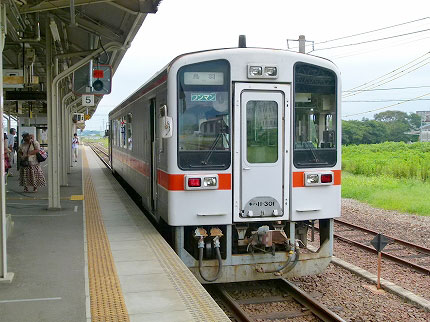 車窓左手に近鉄の電車が現れた。各駅停車である。近鉄もここまで来ると2両で、あちらもローカル線と言えそうだ。近鉄の線路はまた高架になってこちらをまたぎ、いったん離れていく。こちらは右手に単線の線路が寄り添って並ぶ。名松線である。2009年の台風被害で家城から先が不通になり、JR東海はこのまま恒久的にバス代行にする方針を示したものの地元が反発。不通区間の工事費を地元負担して運行再開の見通しだという。